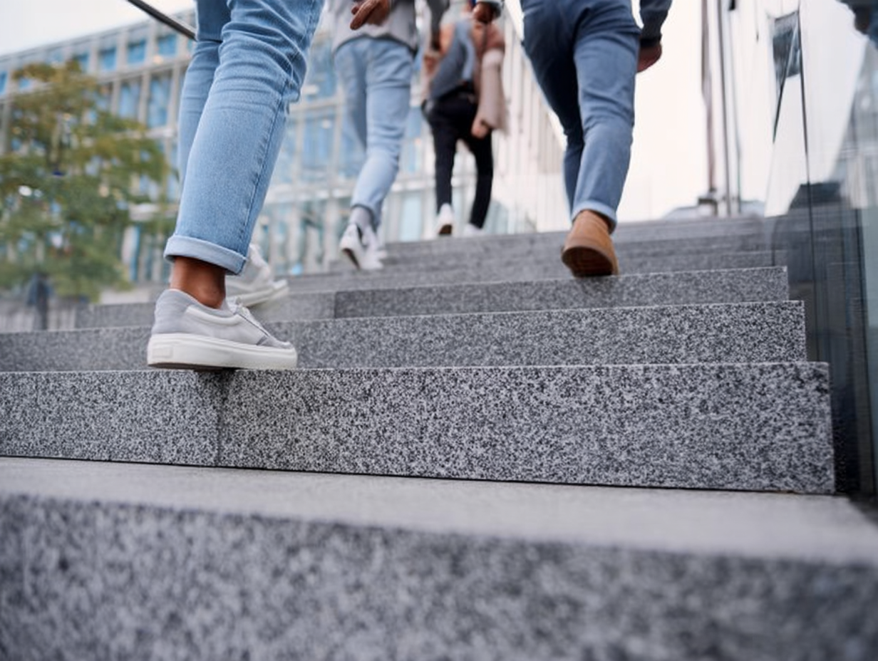 A dynamic low-angle shot captures several individuals actively walking up a sleek, modern set of grey speckled granite stairs in an urban environment. The foreground highlights light blue cuffed jeans paired with stylish light grey slip-on sneakers, while various denim-clad legs and casual footwear ascend behind, conveying a sense of forward movement and purpose. The clean, contemporary lines of the stairs and the blurred glass-fronted building with a hint of greenery in the background contribute to a vibrant, modern city atmosphere. This versatile image is perfect for illustrating concepts of progress, urban lifestyle, daily commute, teamwork, personal journeys, or modern fashion trends, making it ideal for business websites, marketing campaigns, social media content, and editorial features.