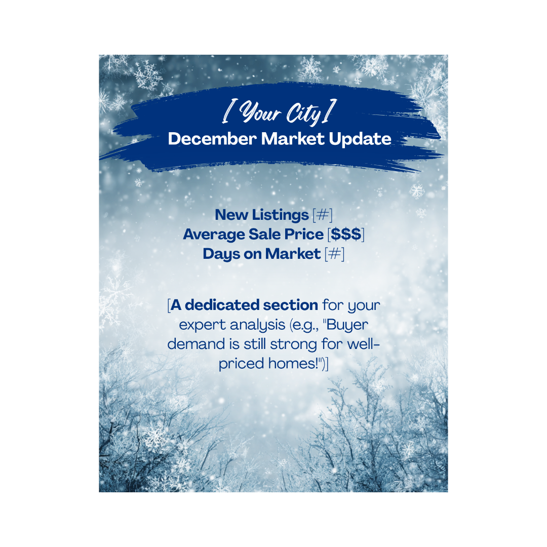 Stay the expert, even during the holidays. This festive "December Market Update" template allows you to share key local stats while maintaining a professional and seasonally appropriate brand aesthetic. It’s the perfect tool to keep your audience informed and attract serious holiday buyers and sellers.
