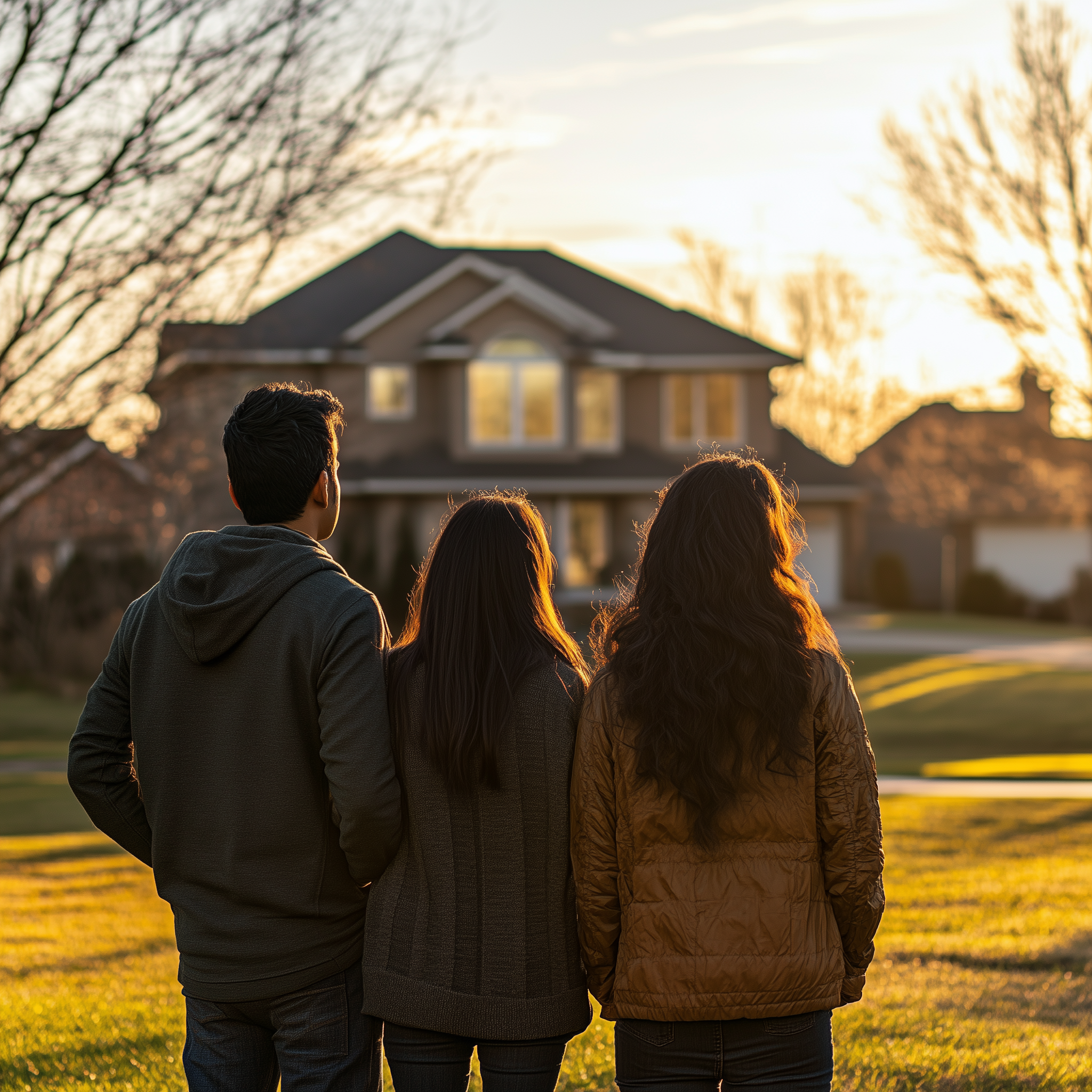 Capture the essence of aspiration and future dreams with this heartwarming image featuring three individuals (a man and two women) viewed from behind, standing on a sun-drenched green lawn. They are gazing intently towards a large, elegant two-story house, beautifully illuminated by the warm, golden light of a setting sun. The rich hues of the golden hour create a serene and hopeful atmosphere, with soft backlighting creating a glowing halo around their hair and silhouetting the house against the bright sky, framed by bare tree branches. This compelling image is perfect for real estate listings, mortgage advertisements, financial planning websites, family lifestyle blogs, social media posts about homeownership, or any marketing campaign focused on new beginnings and achieving life goals.