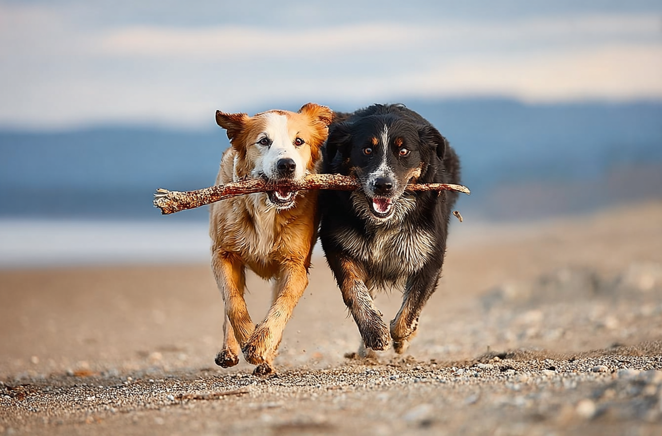 This heartwarming, high-energy image captures two dogs—one golden brown and white, the other black with white and rust markings—mid-stride, joyfully running together on a sandy beach. They share a gnawed wooden stick held firmly in their mouths, their expressions beaming with excitement and camaraderie, showcasing true animal friendship and teamwork. The dynamic composition, sharp focus on their happy faces, and warm, natural daylight create a vibrant and engaging scene against a softly blurred blue and beige background. Perfect for evoking feelings of happiness, adventure, and loyalty, this versatile photo is ideal for pet product advertisements, veterinary clinics, lifestyle blogs, social media campaigns, and travel brochures, highlighting companionship and outdoor fun.