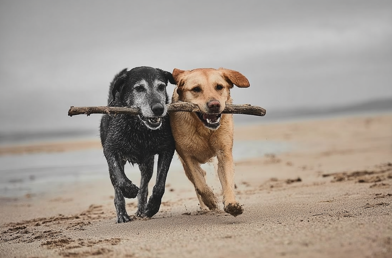 This heartwarming image captures two joyful dogs, a black Labrador with a distinguished graying muzzle and a vibrant golden retriever, enthusiastically running side-by-side on a sandy beach. Both dogs are visibly wet from playing and are happily sharing a single stick held firmly between their mouths, embodying pure companionship and playful energy. The natural color palette of warm sandy browns, muted grays of the overcast sky and distant water, combined with the dogs' contrasting fur and dynamic motion, creates an authentic and spirited scene. This endearing shot is perfect for pet food advertisements, veterinary clinic promotions, lifestyle blogs, social media campaigns, or any content focusing on friendship, loyalty, happiness, and active outdoor life, resonating with anyone who loves animals.