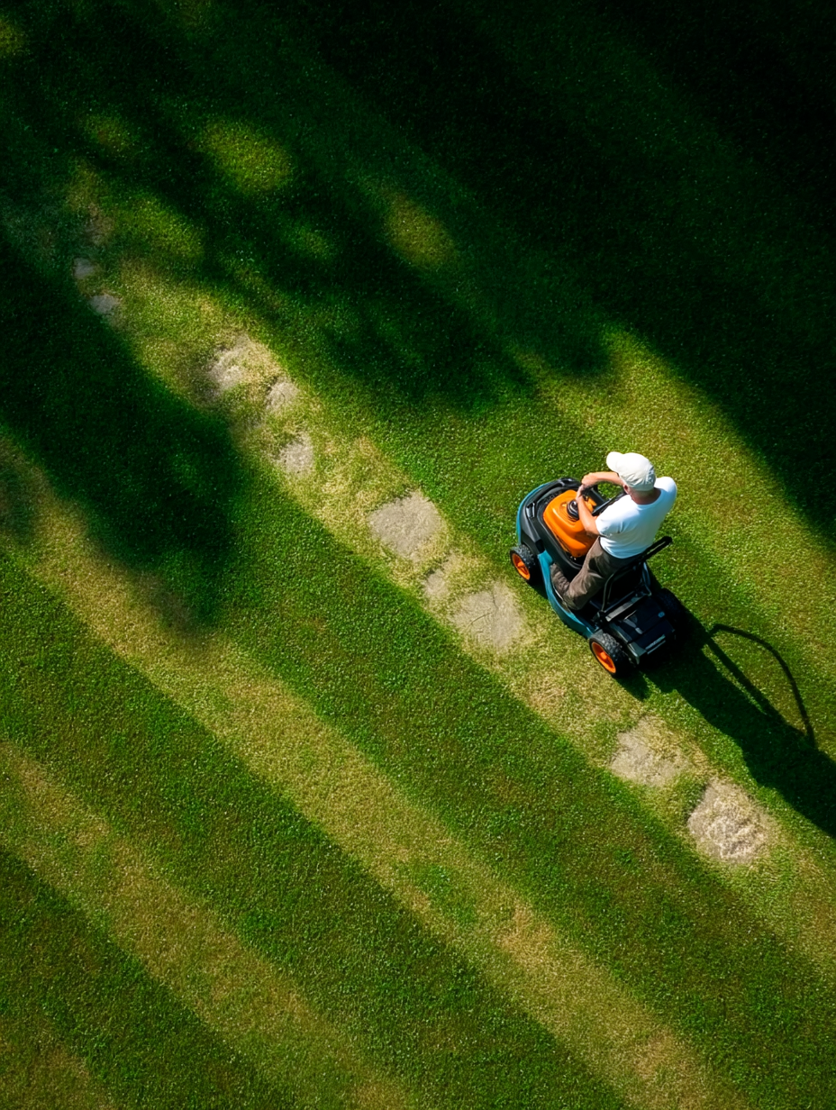 This dynamic, high-angle shot captures a man in a white shirt and cap expertly operating an orange and dark blue riding lawnmower across a lush green lawn. The vivid shades of green, ranging from dark emerald to lighter lime, are beautifully accentuated by long, contrasting shadows and distinct mowed stripes, creating a striking pattern and conveying a sense of order and accomplishment. The unique top-down perspective and strong diagonal lines of light and shadow make for a compelling composition, highlighting the meticulous work involved in outdoor home maintenance. This image is perfect for gardening blogs, home improvement websites, property management services, lifestyle articles, or marketing campaigns for lawn care products and equipment, offering a fresh and engaging visual.
