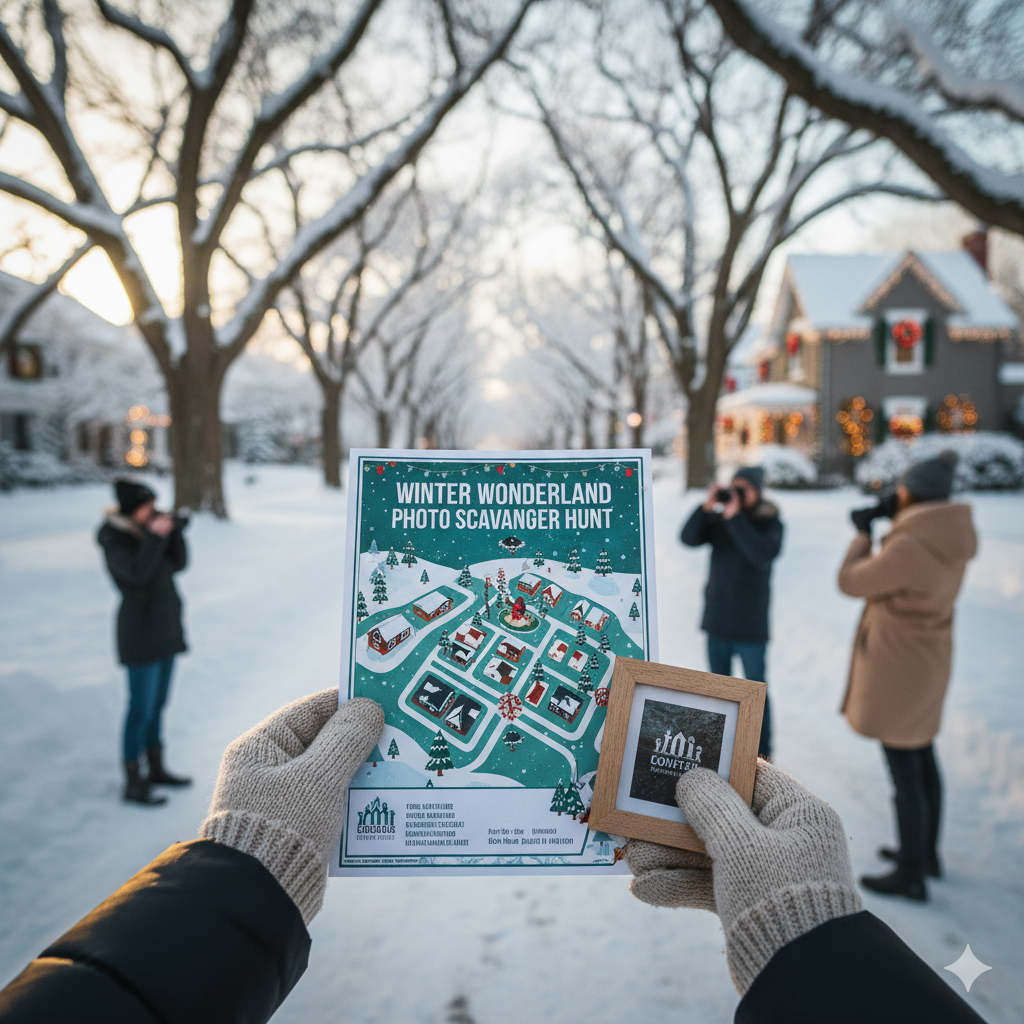 - First-person POV holding a detailed 'Winter Wonderland Scavenger Hunt' flyer.